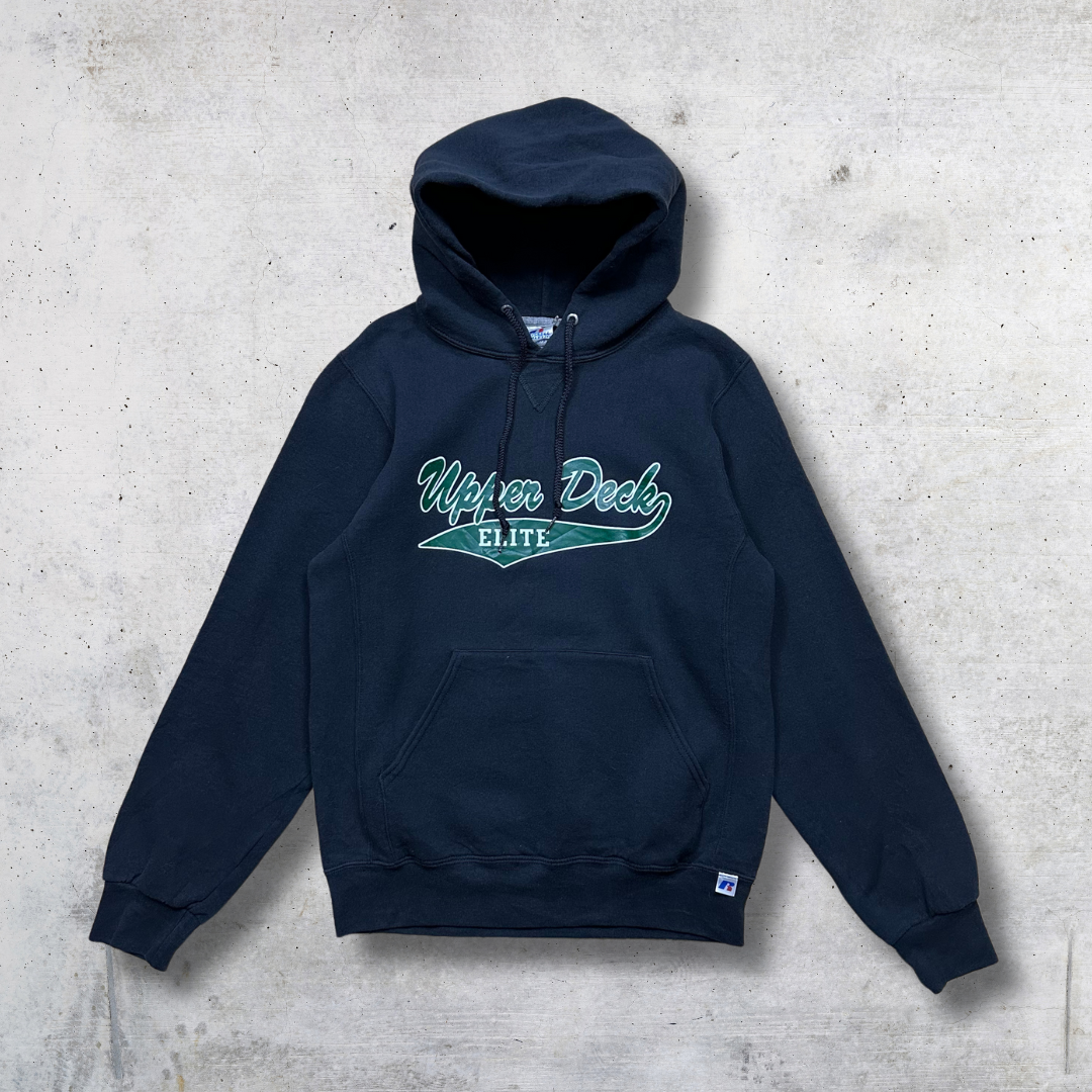 HOODIE RUSSELL UPPER DECK NOIR SEXE : H TAILLE S : AISSELLE 53cm / EPAULE 46cm / LONGUEUR 63cm CONDITION A